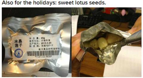 其中,包括了叉烧肉、墨鱼丸、烤麸、腌黄瓜、螺旋藻枸杞月饼、五仁火腿月饼、花生酱、夹心饼干、巧克力夹心饼干等 。