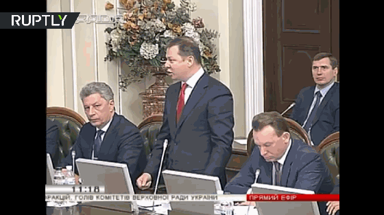 Oleh Lyashko, the leader of Radical Party, said that leader of the Opposition Bloc, Yuriy Boyko, had travelled to Moscow to receive orders from the Kremlin, during a meeting of parliament faction leaders in Kiev. After Mr Lyashko made the accusations, Mr Boyko jumped up and grabbed his head before punching him.