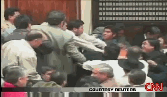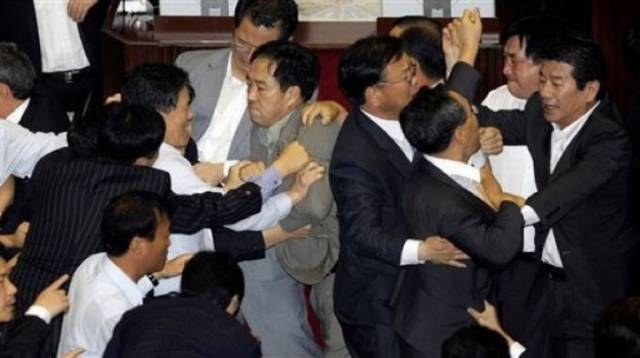 一些议员爬上桌子,高声辱骂对手,另一些人则大动拳脚,向对手身上泼水。