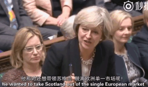 梅:但我想要提醒他的是,也就在几年前吧,他那时还想带领苏格兰脱离欧洲单一市场呢,方法就是把苏格兰从英国独立出去。
