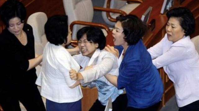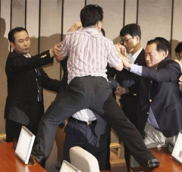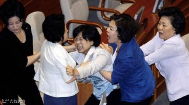 图为2009年7月,韩国国会在《广播法》《网络电视法》等法规投票过程中爆发的激烈冲突。部分反对党议员与执政党议员大打出手,此中不乏女议员们尖叫着互扯头发……数十人受伤,至少一人送往医院紧急治疗。