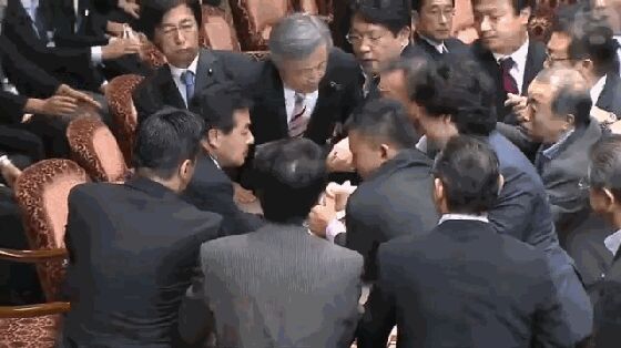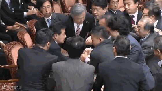 2015年,因为安倍强力在议会推行“新安保法”,直接导致了大量议员抗议,并在议会会议期间大打出手,目标明确,下手稳、准、狠。