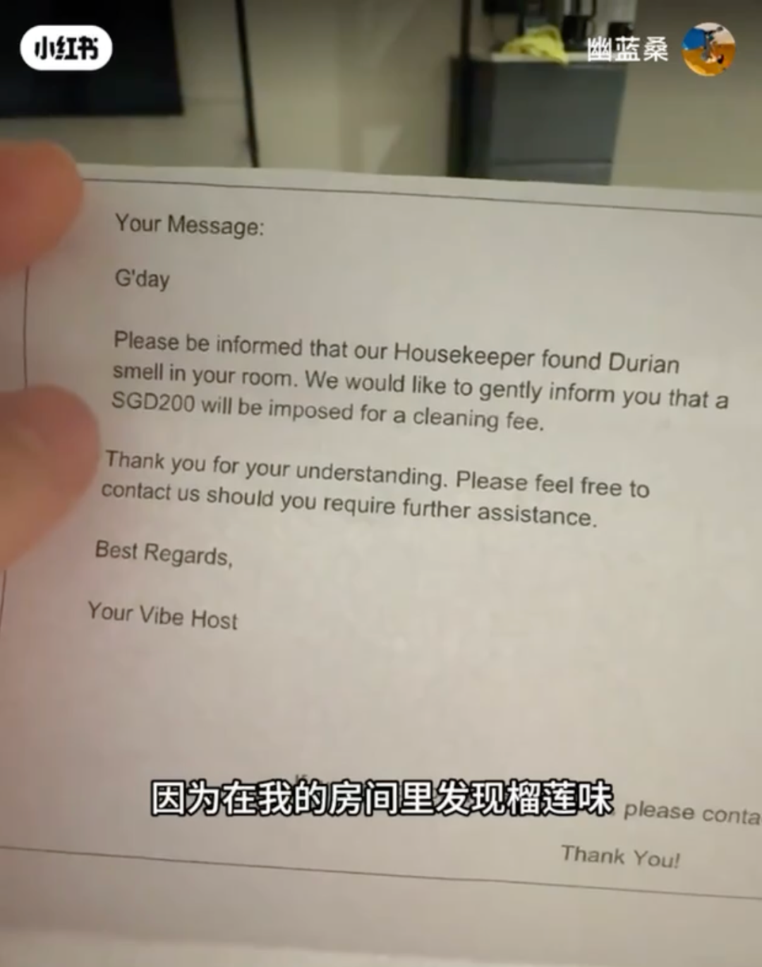 The next day, after she returned to the hotel from a tour around the city, she found a letter that the hotel management had left in her room, informing her that the housekeeping staff had detected the smell of durian in her room, for which the hotel would charge a S$200 cleaning fee.