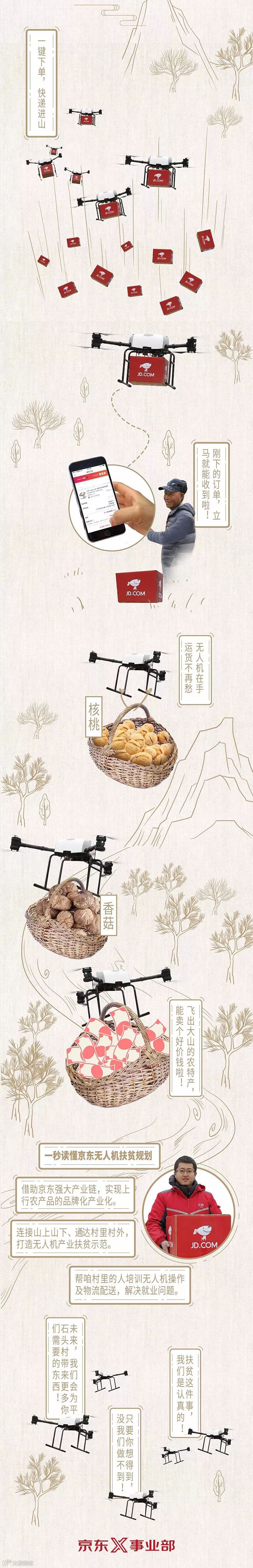 以后大家网上买的东西、急救药品等可以通过京东无人机运进来,村里的核桃、香菇等农产品也可以用它运出去。