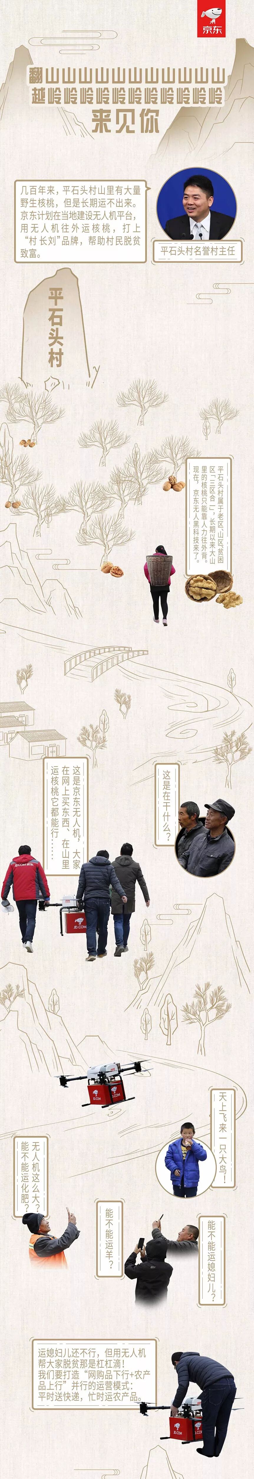 这也印证了平石头村“名誉村主任”刘强东的说法。在今年两会期间的“政协委员谈提高保障和改善民生水平”记者会上,刘强东表示,平石头村几百年以来山里面有大量的野生核桃,但是长期运不出来,农民要到山里采摘再背出来。他还介绍,京东正计划用无人机把核桃从山里运出来,同时打上“村长刘”的品牌,以此作为产业扶贫的重要方式,帮助村民脱贫致富。