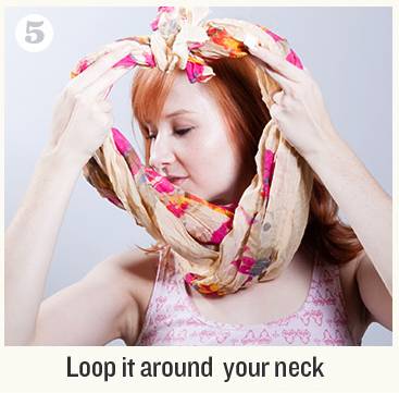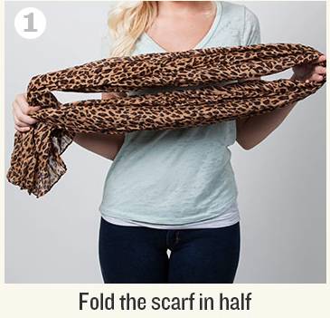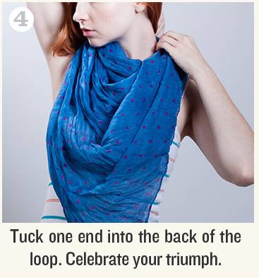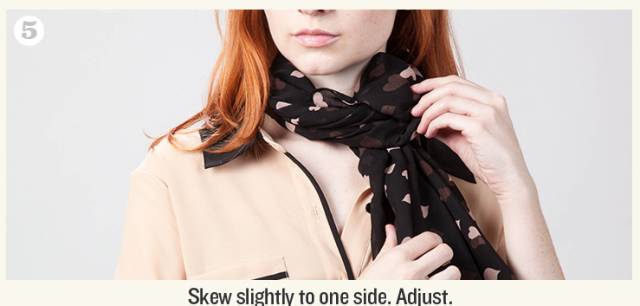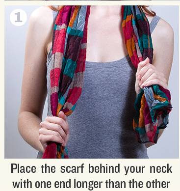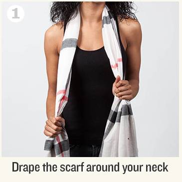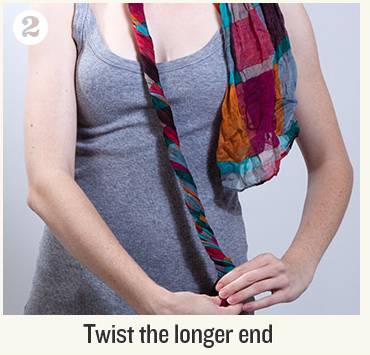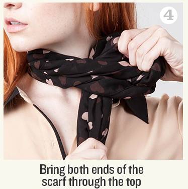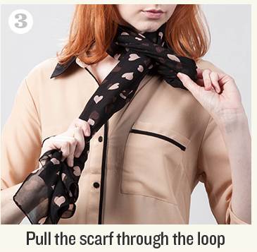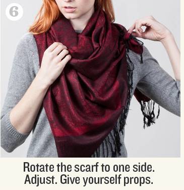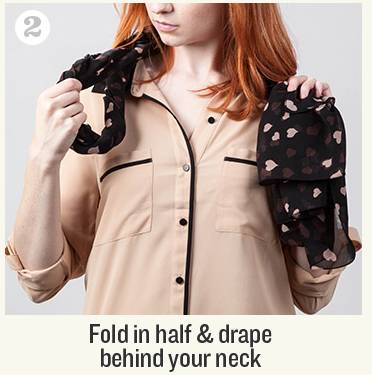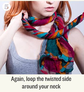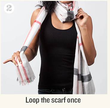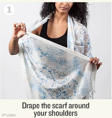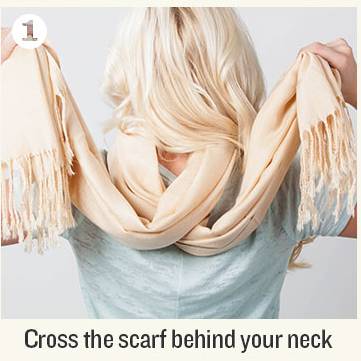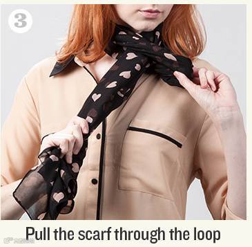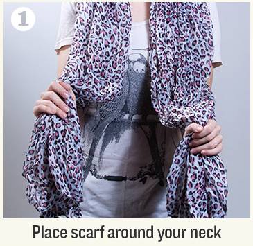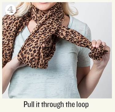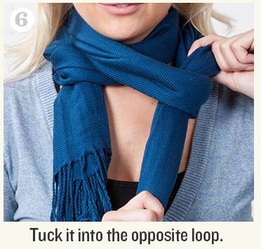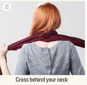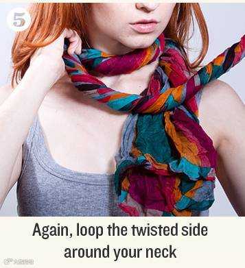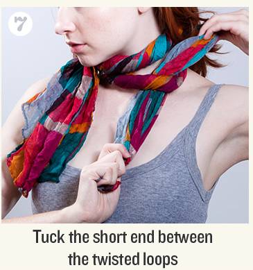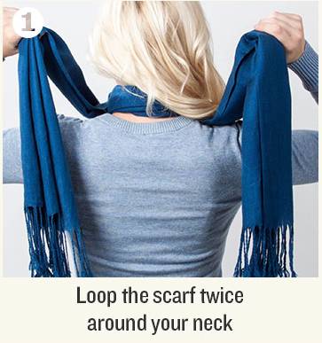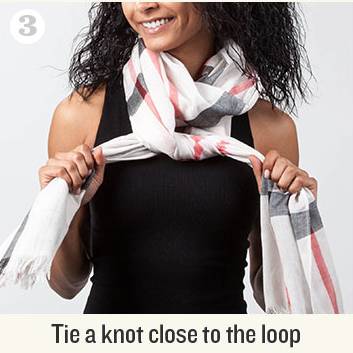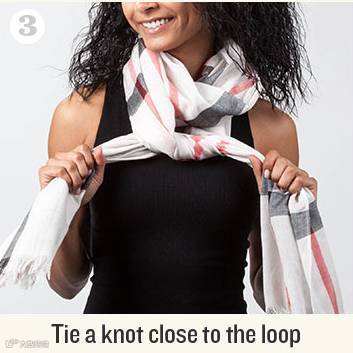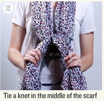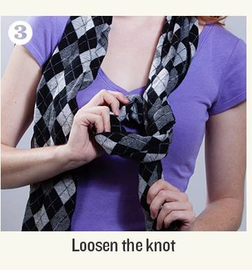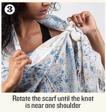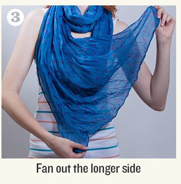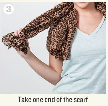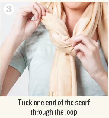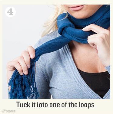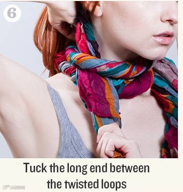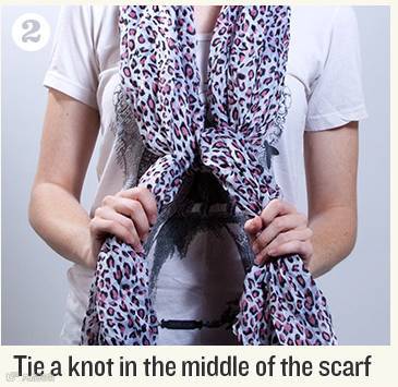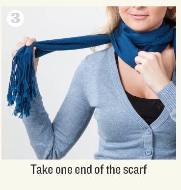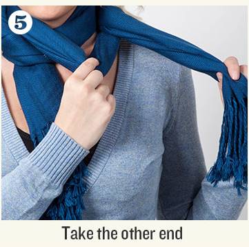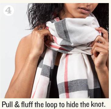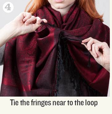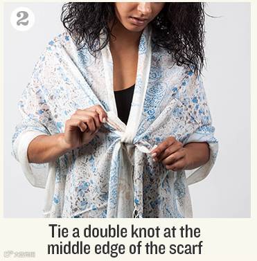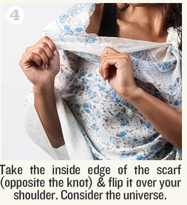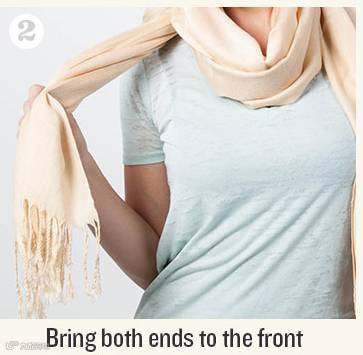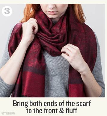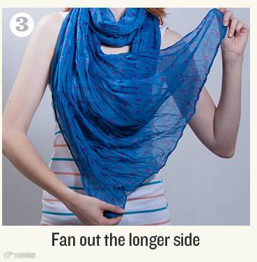 把打结处另一端的围巾翻出来,翻转到肩膀外侧