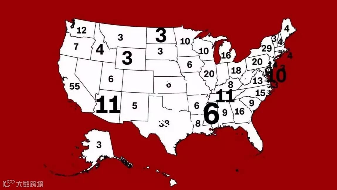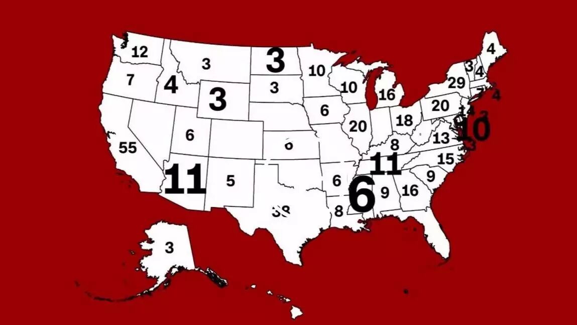 每个州的选举团代表人数基于该州的人口决定。比如怀俄明州有3名代表,纽约州的代表有29名。