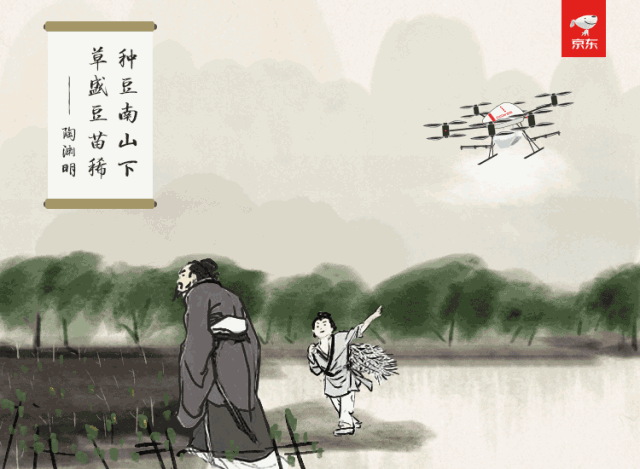 相比苏轼打酱油式地体验农民生活,陶渊明可以说是将种地进行到底。老陶也曾忍不住吐槽:为何我种的豆子老不长苗?因为有虫啊!如果陶渊明生活在今天,他大可一键呼叫京东无人机植保,打药除虫速度贼快,老陶再也不用望虫兴叹了!