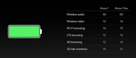 Apple says the iPhone 7 will last at least 2 more hours of battery during daily usage compared to the 6s, and the 7 Plus will offer at least 1 more hour compared to the 6s Plus.