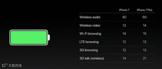 苹果表示,iPhone 7的续航时间将比6s长2个多小时,7 Plus将比6s Plus长至少1个小时。