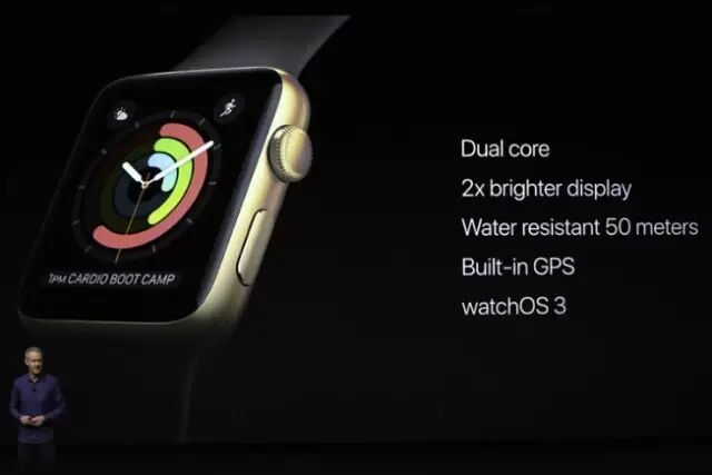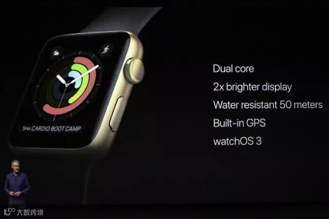此次发布会,苹果还发布了Apple Watch Series 2。下图显示了新一代苹果手表的主要功能:采用双核系统、显示屏增亮2倍、增加了50米防水功能、内置GPS,还新推了watchOS 3系统。