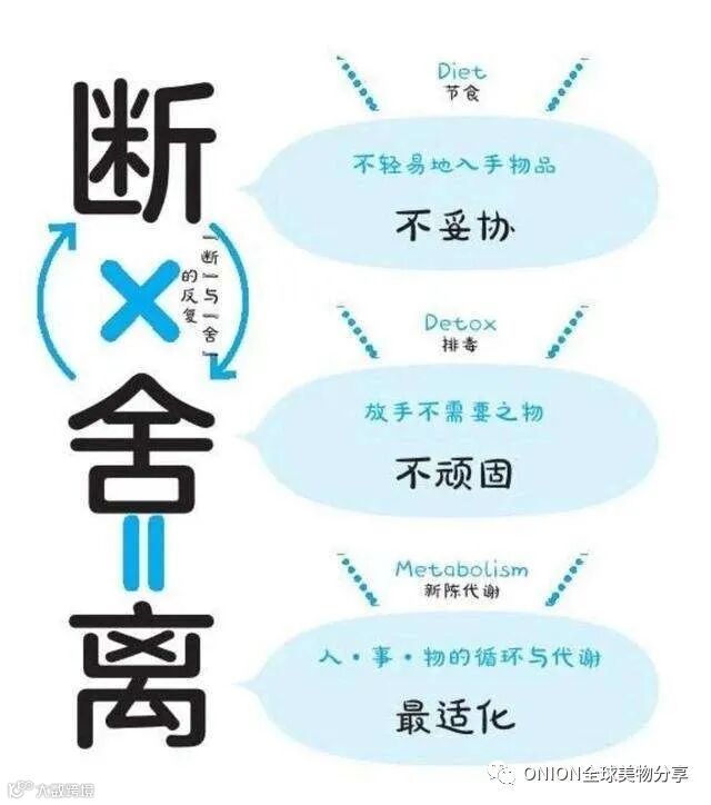 “断,断绝不需要的东西, 舍,舍去多余的废物, 离,脱离对物品的执着, 现在对自己来说不需要的就尽管放手”