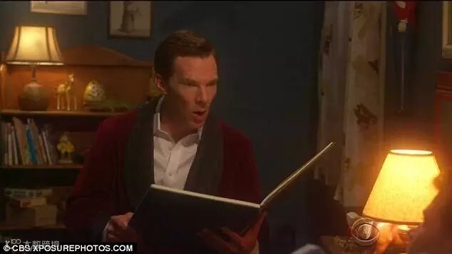 Cumberbatch, clad in a red smoking jacket, enters a cozy children's bedroom where his son Corden, tucked up in bed, pleads with his father for a bedtime story.
