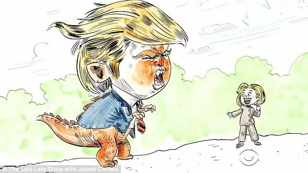 Corden rejects classic stories Peter Rabbit and Goldilocks and the Three Bears in favour of the story of the 2016 presidential election where the protagonist - Democratic candidate Hillary Clinton, dressed in beige, tries to realize her dream of ruling the kingdom.