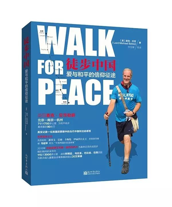 《徒步中国:爱与和平的信仰征途》(Walk for Peace)是贝茨勋爵在中国一路向南时所写的徒步日记,以中英文对照的形式记录了他在去年71天中每一天的所见、所思、所感。
