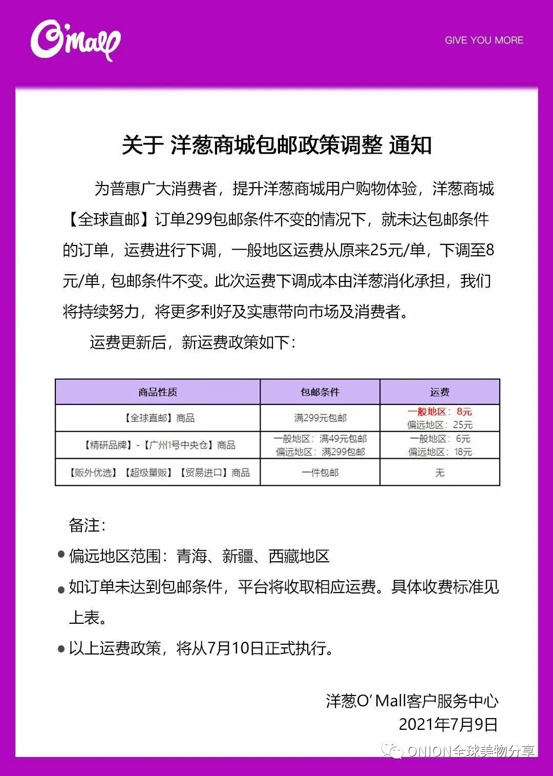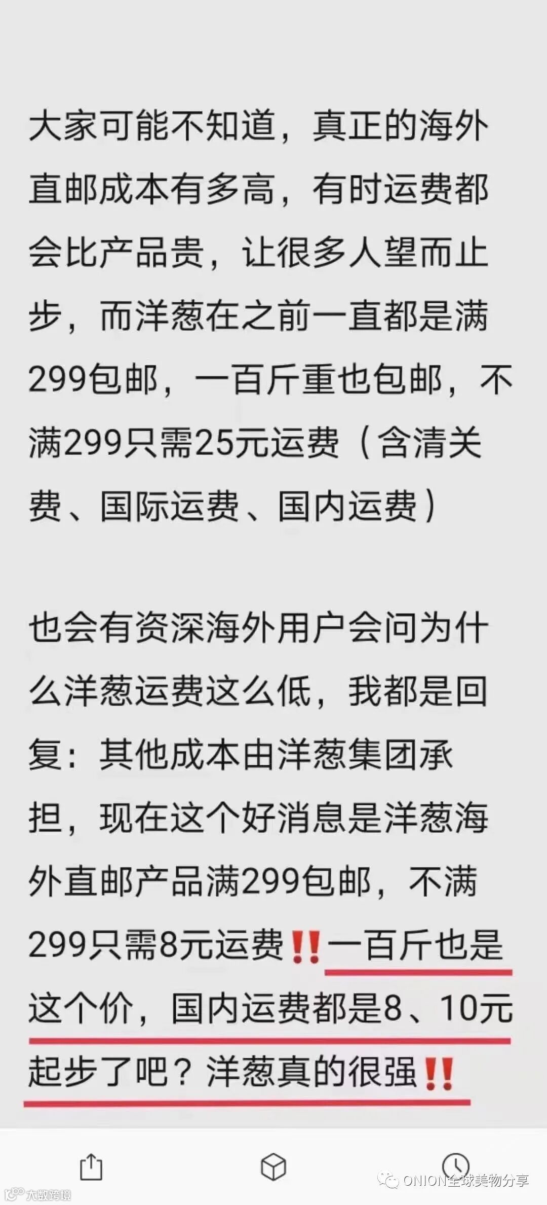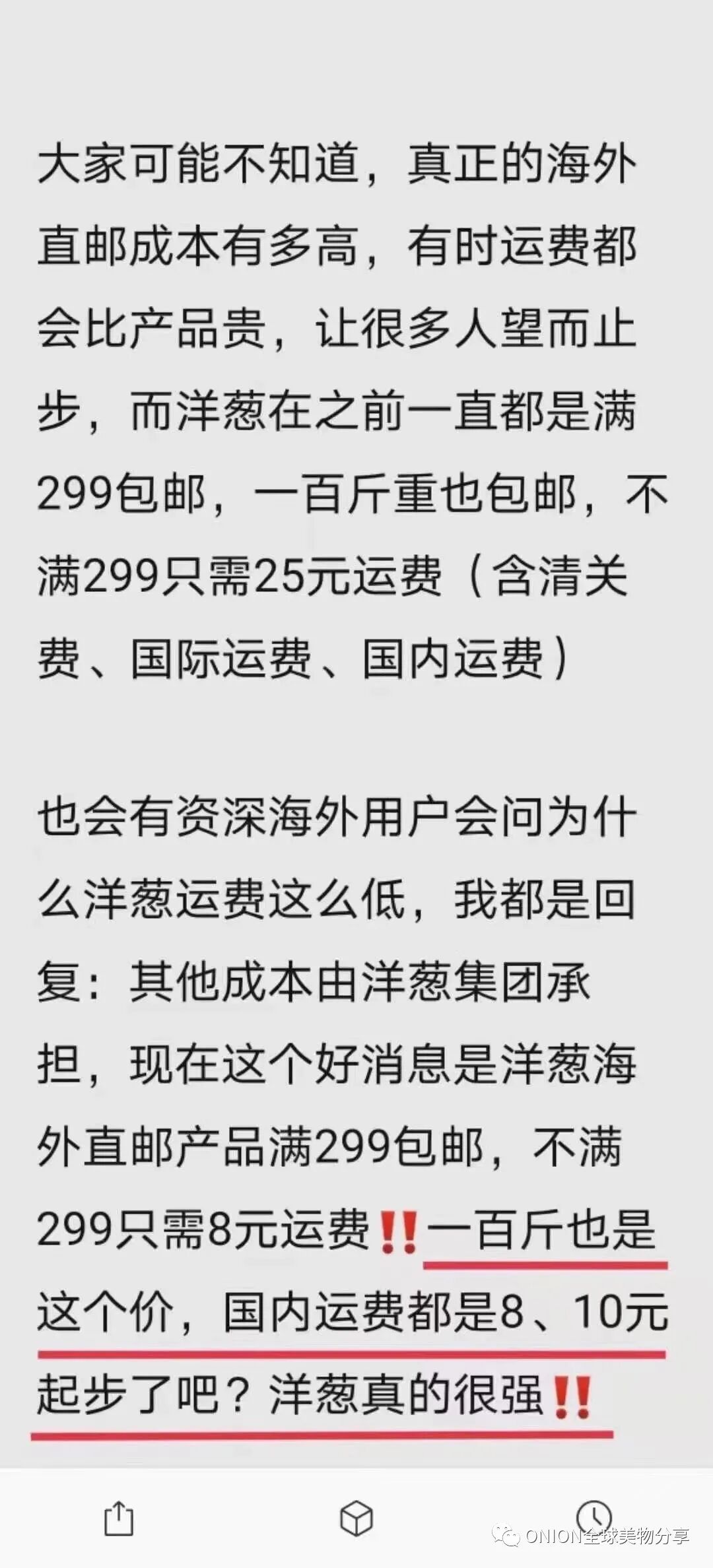再后来,满299包邮,不满的是25元运费;再到今天非偏远地区不满¥299只收8元运费!通关关税等都由洋葱承担!(跟个国内快递无异)