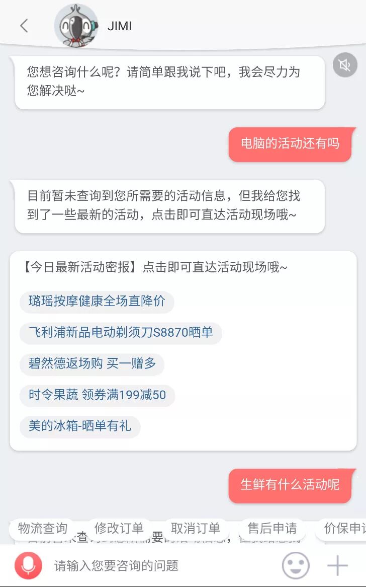 对商品选购有什么疑问?想了解自己的订单到哪里了?去问问京东客服,感受一下无人客服的人工智能魅力吧。