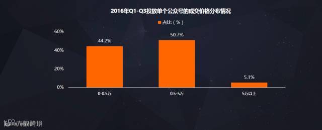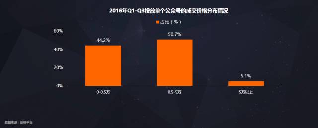 我们知道,头部永远都是一小部分。比如说我们有过一个统计,如果以微信日PV是30亿来算的话,中国微信500强占到2.5亿左右,这是一个极小的金字塔尖。根据新榜平台监测数据,2016年Q1-Q3期间,单个公众号的投放成交价格,半数在5千-5万元之间,5千元以下的成交价格也是主流。