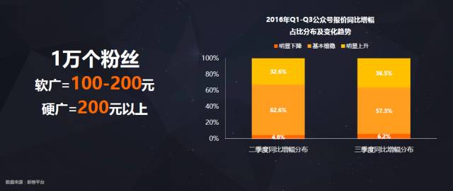 从整体来看公众号、自媒体的报价涨幅一直在上升。我们看到Q1到Q3,有60%左右的公众号报价保持稳定,但是还有30%左右在上升。