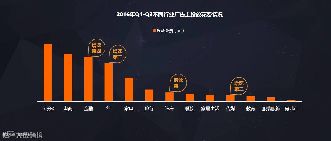 首先,我们看到互联网类别的广告主是投放额度最高的。新兴的公司,不管是App、游戏类型的,都有非常高的投放额。前几大类正是我们平常感受到比较多的类型,包括互联网、电商、金融、3C、家电、汽车这样一些类别。