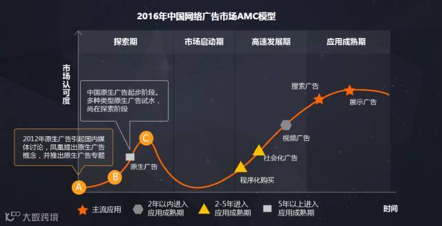 在中国,原生广告还处于探索时期。下图的曲线提到了,每一种广告形态出现以后,从开始到发展,到繁荣昌盛,再到探索出更多模式之间的趋势。中国大约在2012年提出了原生广告的概念,然后逐步试水,现在已经进入到积极探索的时期。相比较而言,像程序化购买、DSP还有一些视频贴片广告,已经发展到成熟期,而原生广告在中国还有非常大的发展潜力和探索空间。