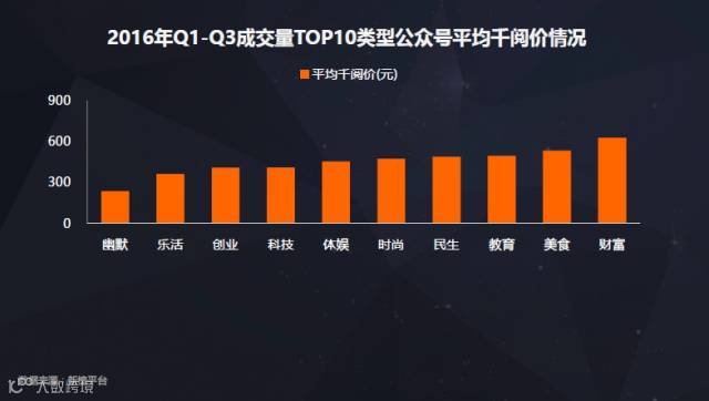 新榜数据显示,整体平均千阅价为514元。大家可能会觉得真的有这么高吗?这里我解释一下,这个千阅价是以10万阅读数为基础的,没有计入10万以上的数字。所以真正的千阅价可能会低一点,但我们预测下来也应该在400左右。大众号的千阅价会低于垂直号。财富、美食、教育是平均千阅价最高的,而幽默类别是千阅价最低的。