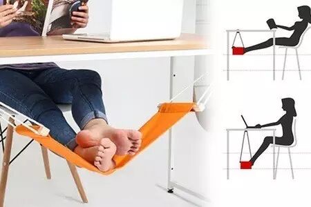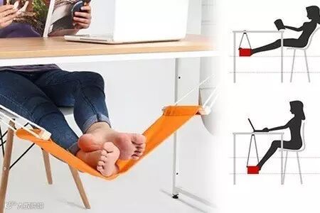 这种歇脚神器可以通过支架固定在桌下的适当位置,两边可调节的带子可以让你随心调整小吊床高低。(想想都很爽啊~~)
