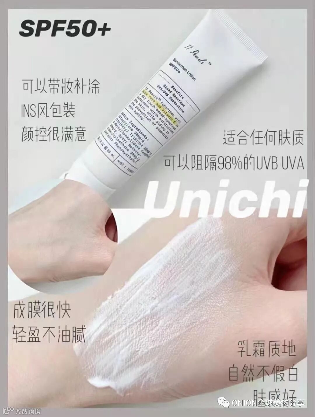 Unichi 11 Pearls 轻盈亮白滋养舒缓防晒乳液 SPF50+ 为一款轻薄、滋润的防晒乳霜。含有SPF50+的防晒指数可保护肌肤免受UVA和UVB的伤害,避免肌肤因日晒出现干燥、细纹等问题。其富含的芦荟和维生素E,可以延缓皮肤衰老;帮助肌肤抵御环境污染、辐射、紫外线损害,让皮肤无负担的防护,并显现健康光彩。