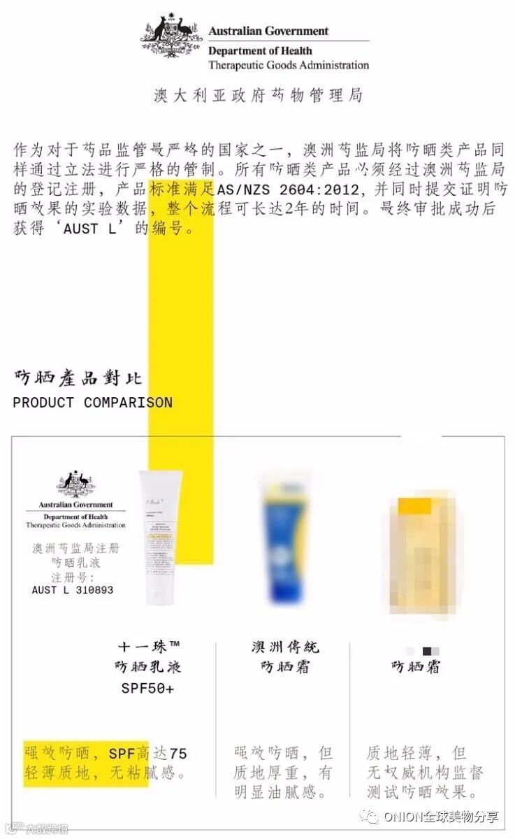 大家在Unichi的十一珠防晒乳的外包装上可以很清楚的看到标有“AUST L”的编号。这个编号可不是随便就能写的。在澳洲,防晒霜,不单单是“护肤品”,他跟保健品,药品一样都归澳洲药监局TGA监管。而且需要经过澳洲政府认可的实验室的检测,证实成分安全,宣传相符才能上市销售。