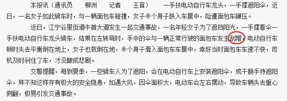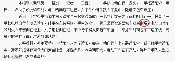 ▲《南京日报》2016年9月14日8版《女子打伞骑车摔倒车肚下》文中:结果在左转弯时,手中的伞与一辆正常行驶的面包车发生刮蹭。
