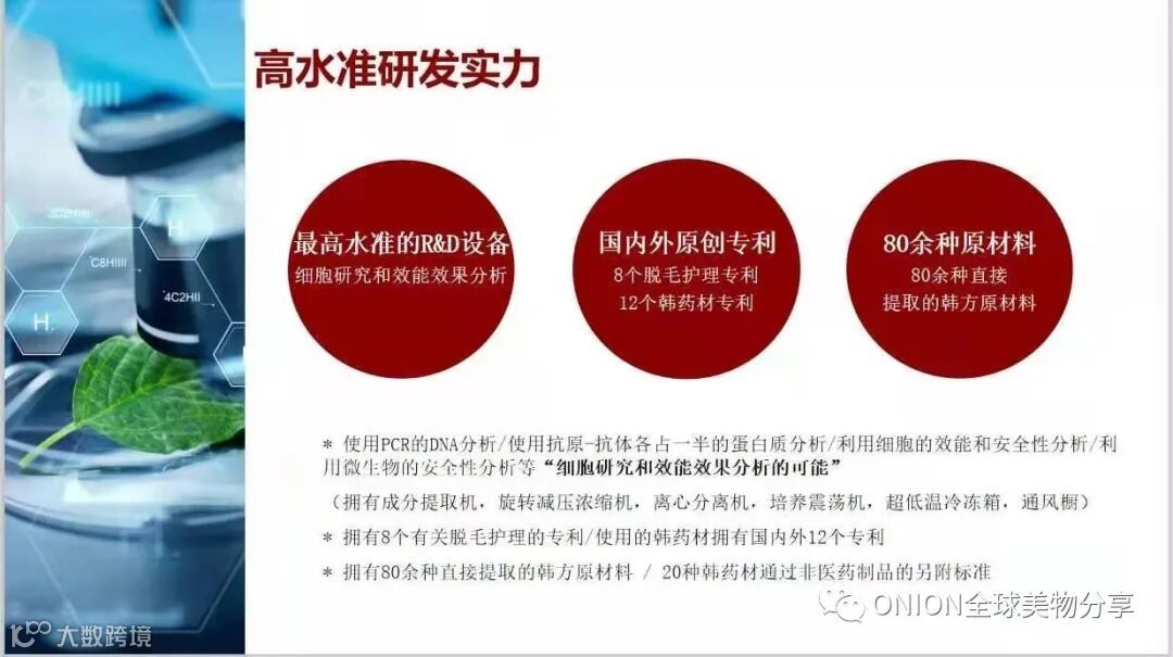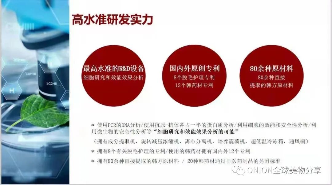 康绮墨丽在韩国是有专属的研究所,而且这个研究所拥有高水平的研发实力,有最高水准的细胞研究和效能效果分析,同时拥有8个脱毛护理专利和12个韩药材专利,并且使用80余种直接提取的韩方原材料来研制产品。