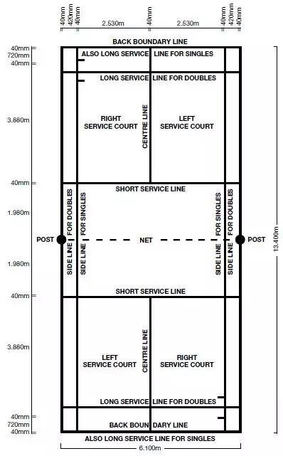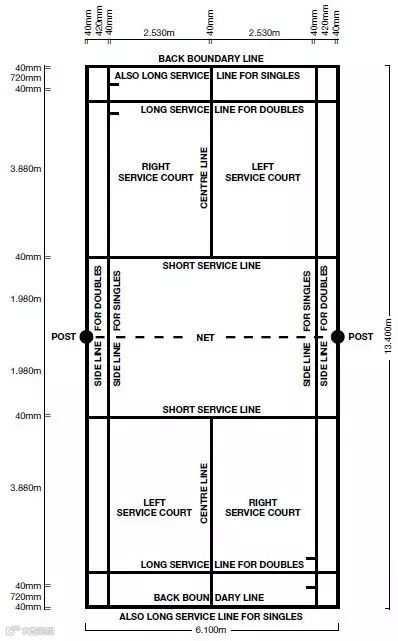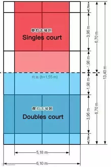 双打击球区(doubles court)比单打击球区(singles court)更大。