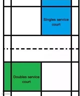 蓝色区域为单打发球有效区(Singles service court);绿色区域为双打发球有效区(Doubles service court)。