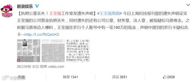 今天上午,王宝强工作室发出声明,称王宝强公司营业执照丢失,同时丢失的还有公司公章、财务章、法人章,疑被马蓉卷走。