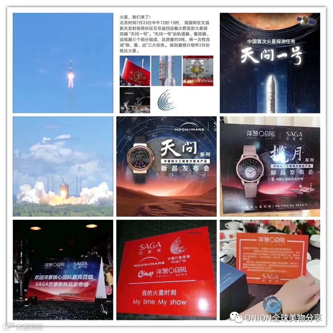 SAGA世家表首席运营官刘仁提到,洋葱O'MALL与SAGA世家表的首次“奇妙之缘”建立在7月23日的海南文昌之旅,共同见证了中国首次火星探测器“天问一号”发射成功。