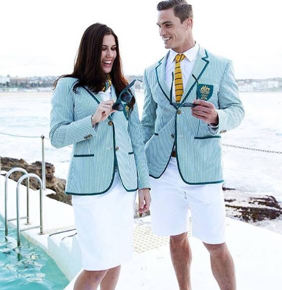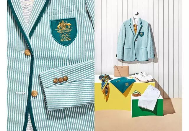 担任设计的是澳大利亚本土品牌Sportscraft,创建至今有102年的历史。选用的也是澳大利亚奥运队服惯用色——蓝绿色调。薄荷绿与白色条纹相间的西装外套搭配白色短裤短裙。
