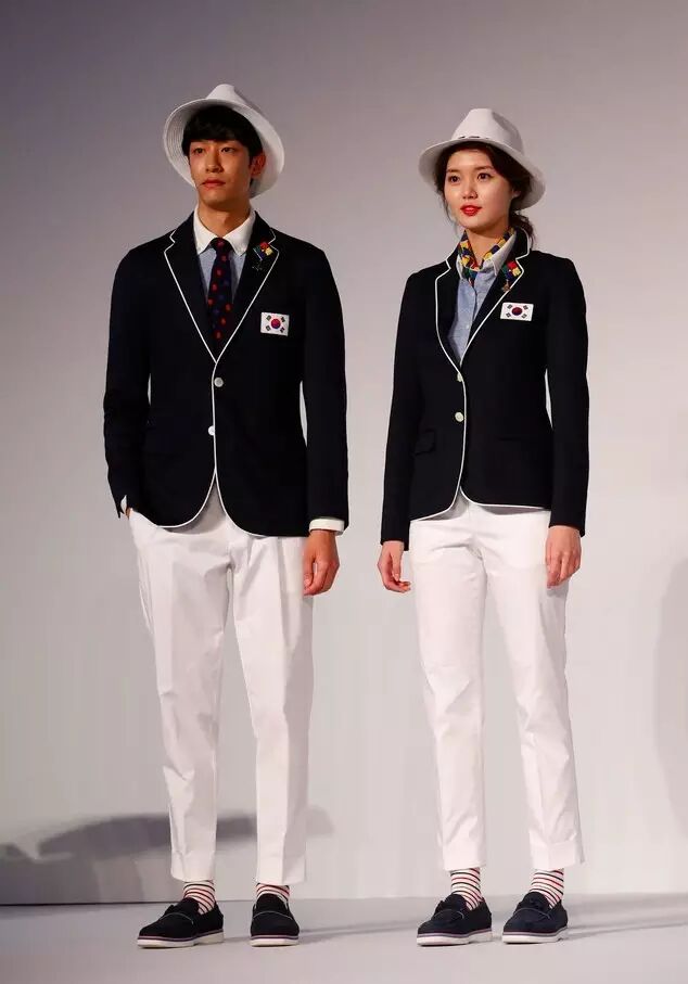 韩国队服由韩国休闲品牌 Beanpole 打造。白色与海军蓝的组合,利落清新。帽子、胸针、腰带等配饰都显示了热情和活力。
