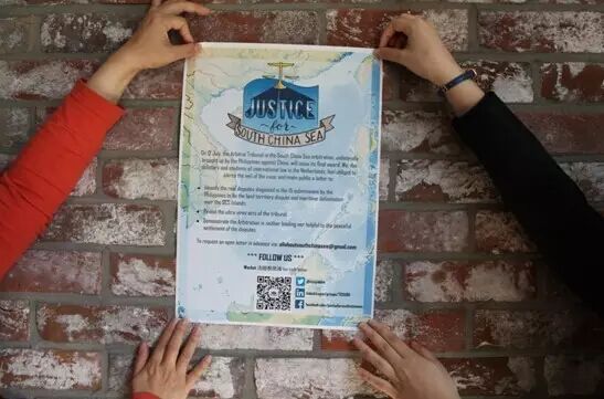 旅荷国际法学学者海牙展示海报,宣传他们针对南海仲裁案撰写的公开信,寻求国际法正义。
