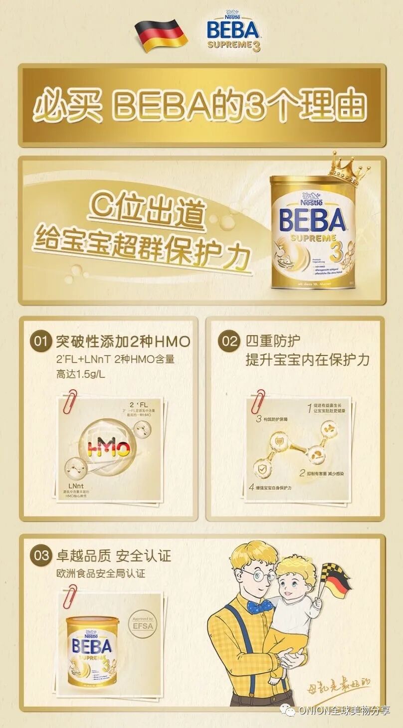德国雀巢BEBA SUPREME至尊版,是深度模拟母乳,其营养成分与母乳接近,是目前市面上最接近母乳的配方奶粉之一,且率先在奶粉中添加2种母乳低聚糖HMO,(2’FL,LNnt),添加的HMO和母乳中的HMO结构相同,且数量和含量上接近母乳,这是目前很多奶粉都无法比拟的,BEBA至尊是德国雀巢多年研究和专业知识积累的结晶。