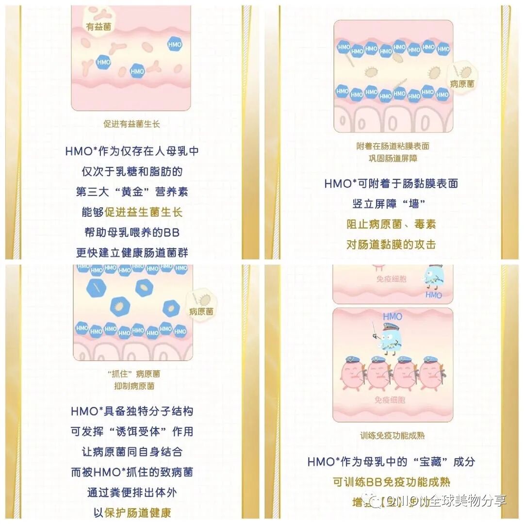 HMO是母乳中第一大活性营养,对于宝宝免疫力至关重要,儿科专家推荐无法母乳喂养的宝宝选择含HMO的奶粉。HMO(human milk oligosaccharides)中翻译为“母乳低聚糖”或“母乳寡糖”,是母乳中第三丰富的固体成分(仅次于脂肪和乳糖),含量为5~15g/L,具有调节免疫,帮助大脑发育及调节肠道菌群等功能,有助于婴幼儿成长发育。