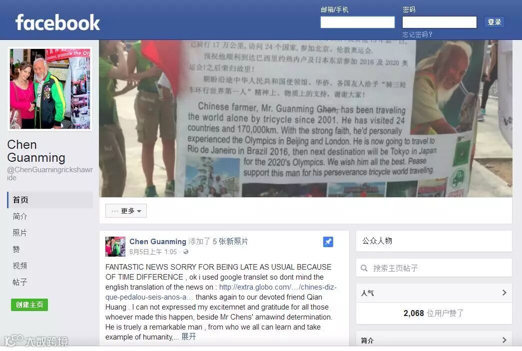 Zsofia Korodi是一位住在伦敦的匈牙利人,他因为老陈的壮举而备受启发,并为他创建了一个facebook主页,于是老陈的支持者现在有办法追踪他的行程了。