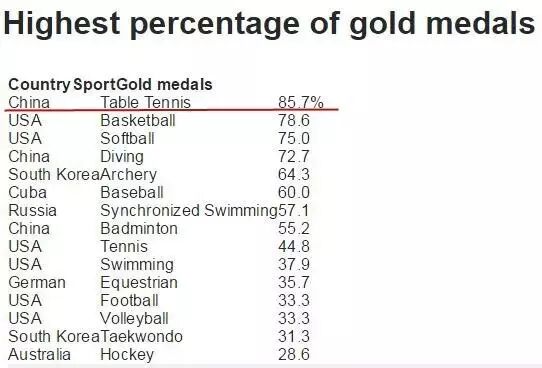 中国乒乓的得金率是85.7%,远高于美国的篮球78.6%。