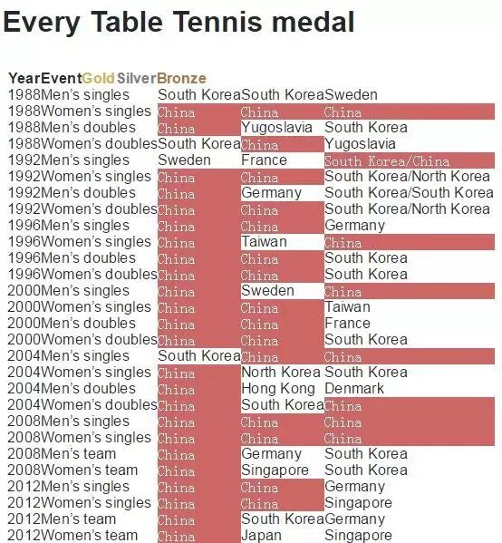 我们查了一遍数据发现,中国在乒乓球运动中的霸主地位无人能及。
