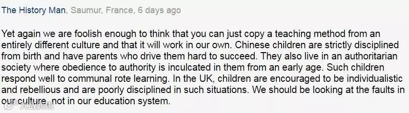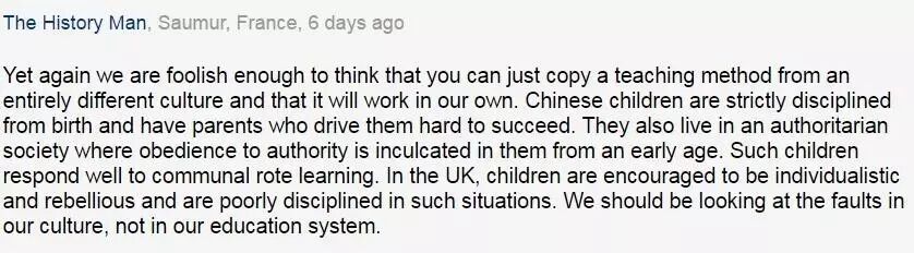 又傻了吧,觉得可以直接从一个完全不同的文化中复制一套教育方法拿过来用。中国的孩子生下来就有严格教养,家长拼命让他们成功。他们从小生活在服从权力和权威的社会。这样的孩子对集体机械式教育非常适应。在英国,人们鼓励孩子张扬个性和叛逆精神,他们在这种教育环境中很难管教。我们应该从文化根源上找问题,而不是从教育体系找。