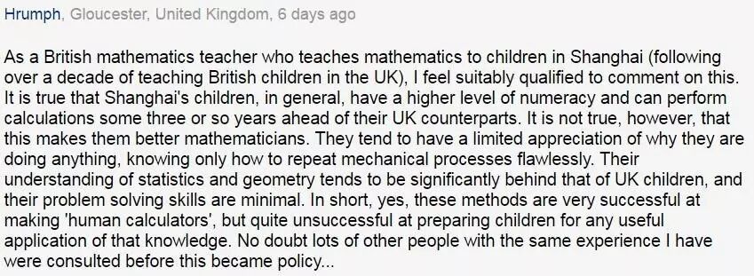 作为一名在上海教数学的英国数学老师(我之前在英国教了十几年),我觉得自己有资格对这件事做些评论。没错,上海的孩子一般来说是要在计算能力方面比英国同龄人领先3-4年。但是这不意味着他们会成为更好的数学家。他们不是很清楚他们为什么要这么做,只知道准确无误地机械重复过程。他们对统计和几何的理解要落后于英国的学生,他们解决实际问题的能力也比较弱。总而言之,是的,这些教学方式非常成功地把他们培训成“人类计算器”,但在知识的运用方面打得基础则比较弱。