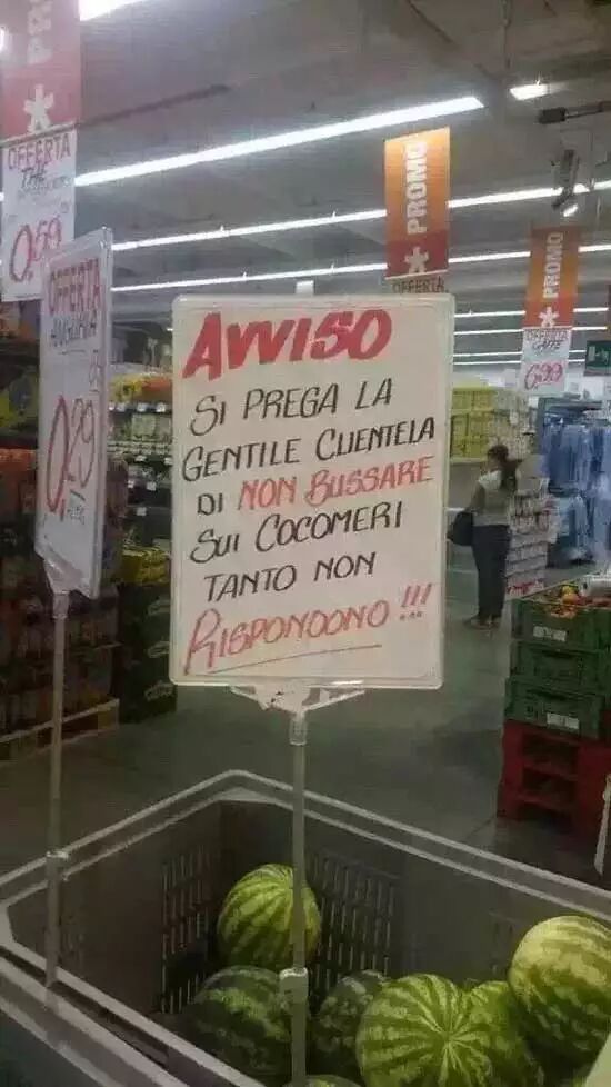 一位中国社交网站用户发布了下面这张照片,照片上,这家意大利超市挂出一则标识,要求顾客不要敲西瓜。这则标识插在装满西瓜的板条箱里,其上写道:“请不要再敲西瓜了,西瓜不会回应你。”