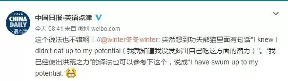 @winter冬冬winter: 突然想到功夫熊猫里面有句话"I knew I didn't eat up to my potential(我就知道我没发掘出自己吃这方面的潜力)"。“我已经使出洪荒之力”的译法也可以参考下这个,说成“I have swum up to my potential.”