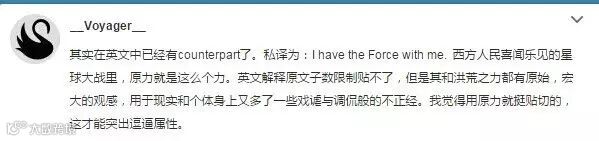 @__Voyager__:其实在英文中已经有counterpart了。私译为:I have the Force with me. 西方人民喜闻乐见的星球大战里,原力就是这么个力。英文解释原文字数限制贴不了,但是其和洪荒之力都有原始,宏大的观感,用于现实和个体身上又多了一些戏谑与调侃般的不正经。我觉得用原力就挺贴切的,这才能突出逗逼属性。