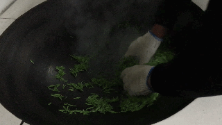 鲜绿的嫩叶下锅以后滋滋作响,几分钟以后,一股美妙的香气弥漫在厨房里。我的感觉就像是来到了鲜花盛开的花园。经过半个小时不断的翻炒、抖动和揉捻,茶叶炒成了,叶片卷曲,白毫毕现。