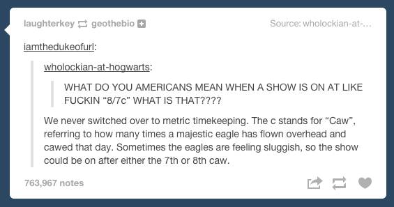 我们从来没有采用过公制计时。C代表“Caw”(老鹰、乌鸦等的叫声),指一只威武的雄鹰划过头顶和鸣叫的次数。有时候,老鹰会有些犯懒,所以节目就是老鹰鸣叫第7声,也有可能是第8声的时候播出。
